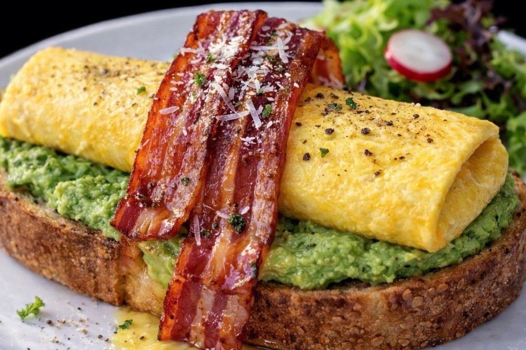 Toasted Sourdough Bread, Guacamole Spread, Bacon, Omelette , Parmesand Cheese, Mix salad, Hash brown