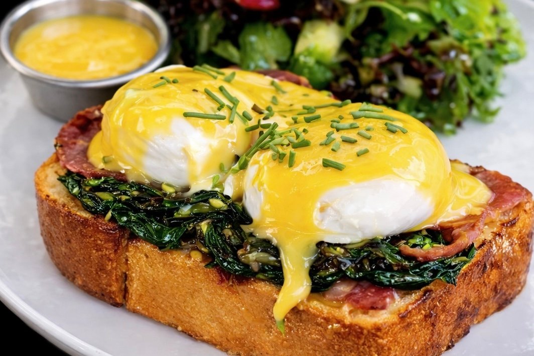 Brioche , 2 Poached Egg, Bacon, Spinach, Hollandaise sauce, 1pc Hash Brown