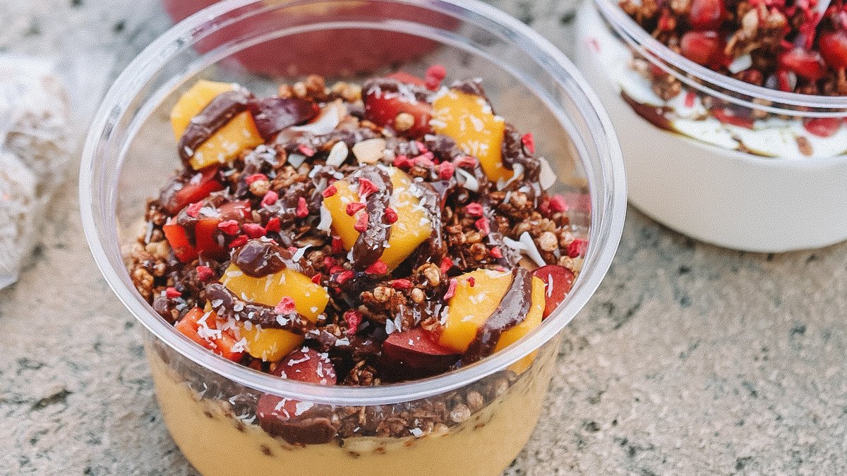 banán, mangó, barack, kókuszkrém, vanilliás protein, chia mag, menta topping: házi vegán granola, idénygyümölcsök, kendermagpehely allergén: mandula, dió