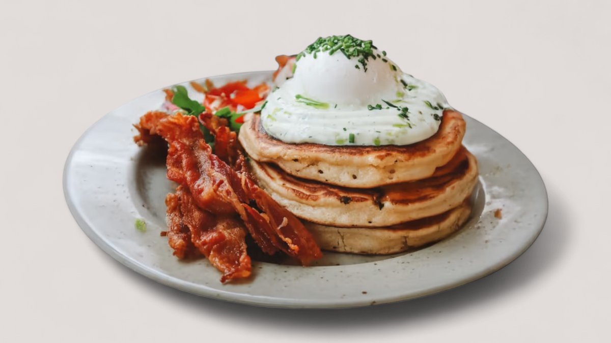 házi gluténmentes palacsinta, zöldfűszeres ricotta, cheddar sajt, crispy bacon, buggyantott tojás, marinált hagyma, kevert saláta gluténmentes allergén: tejtermék (a buggyantott tojást kicsit keményebbre főzzük, hogy a szállítás során ne essen baja)