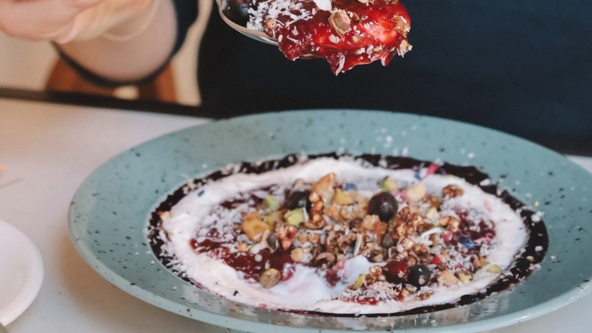 házi vegán csokoládés granola, fűszeres meggylekvár, feketeribizli zselé, pisztácia crumble görög joghurttal vagy házi vegán kókuszjoghurttal hozzáadott glutént nem tartalmaz allergén: laktóz, diófélék *a kép a valóságtól eltérhet