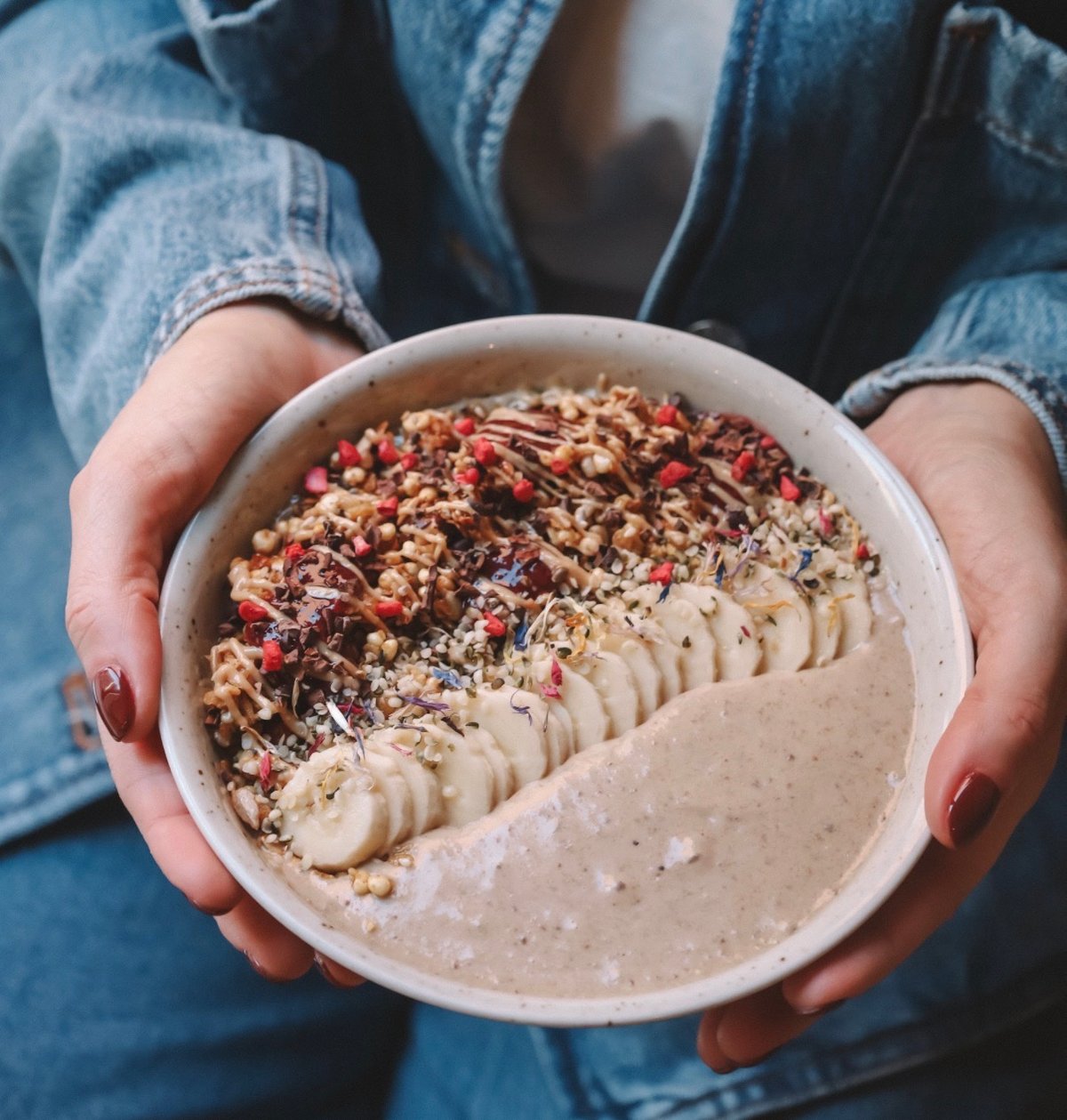 banán, avokádó, áfonya, kókuszjoghurt, chia mag, kókusztejszín, vaníliás fehérje, lime topping: házi csokoládés vegán granola, pisztácia crumble, tahini karamell, friss gyümölcsök, kókuszreszelék, feketeribizli zselé allergén: diófélék, szezámmag *a kép a valóságtól eltérhet