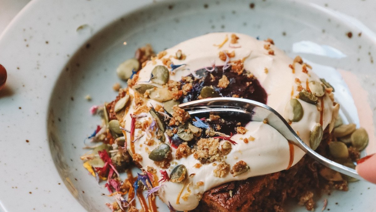gluténmentes loaf, karamell hab, feketeribizli zselé, tökmag crumble, tahini karamell allergén: diófélék