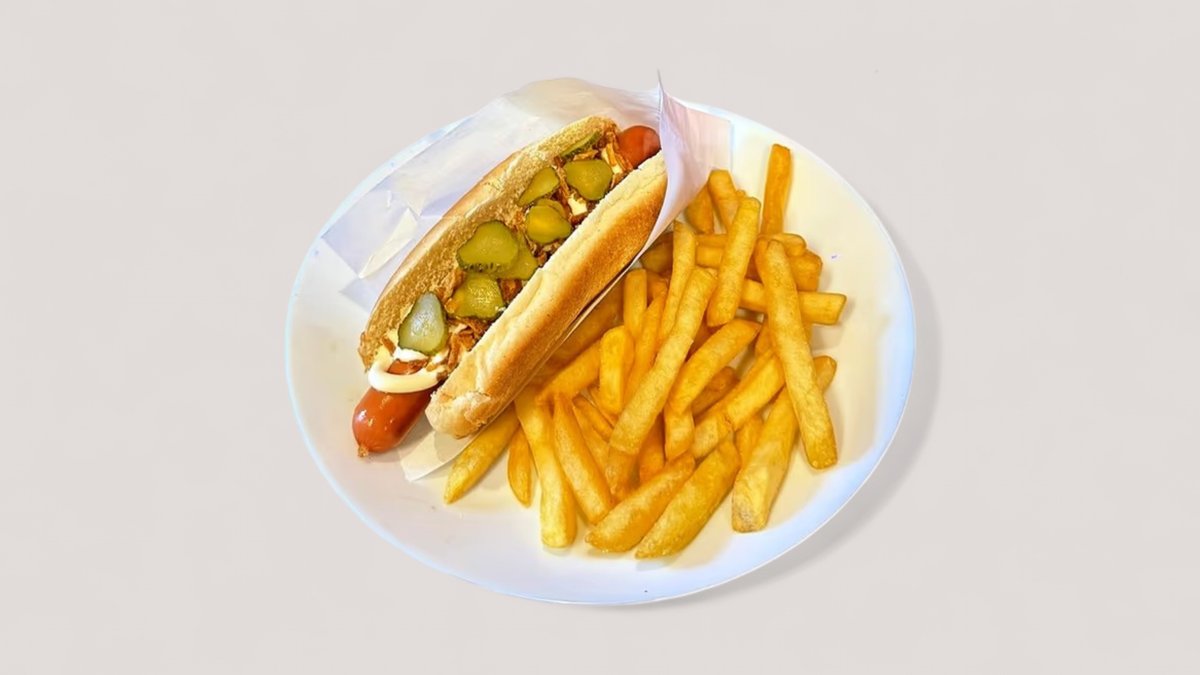 1db amerikai hot-dog frankfurti virslivel, választható szószokkal/ feltétekkel , 1 adag hasábburgonyával és választható üdítővel