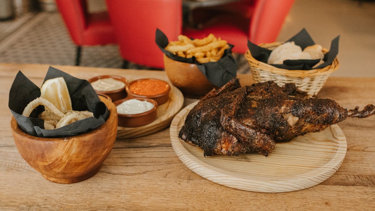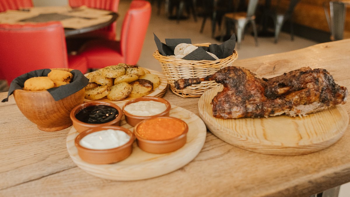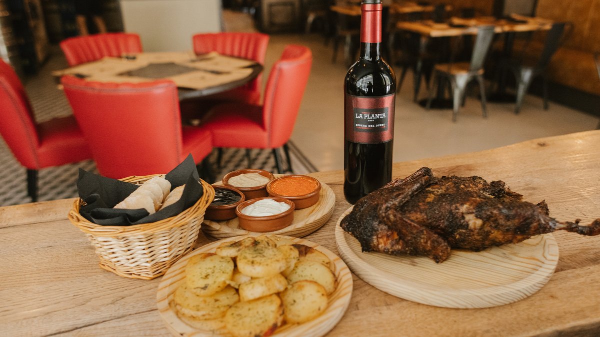 Egész csirke + krumpli + szósz + kenyér + 1 üveg La planta spanyol bor