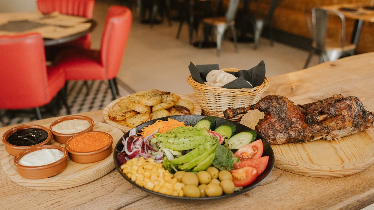 Whole chicken + potatoes + sauce + bread + mixed salad