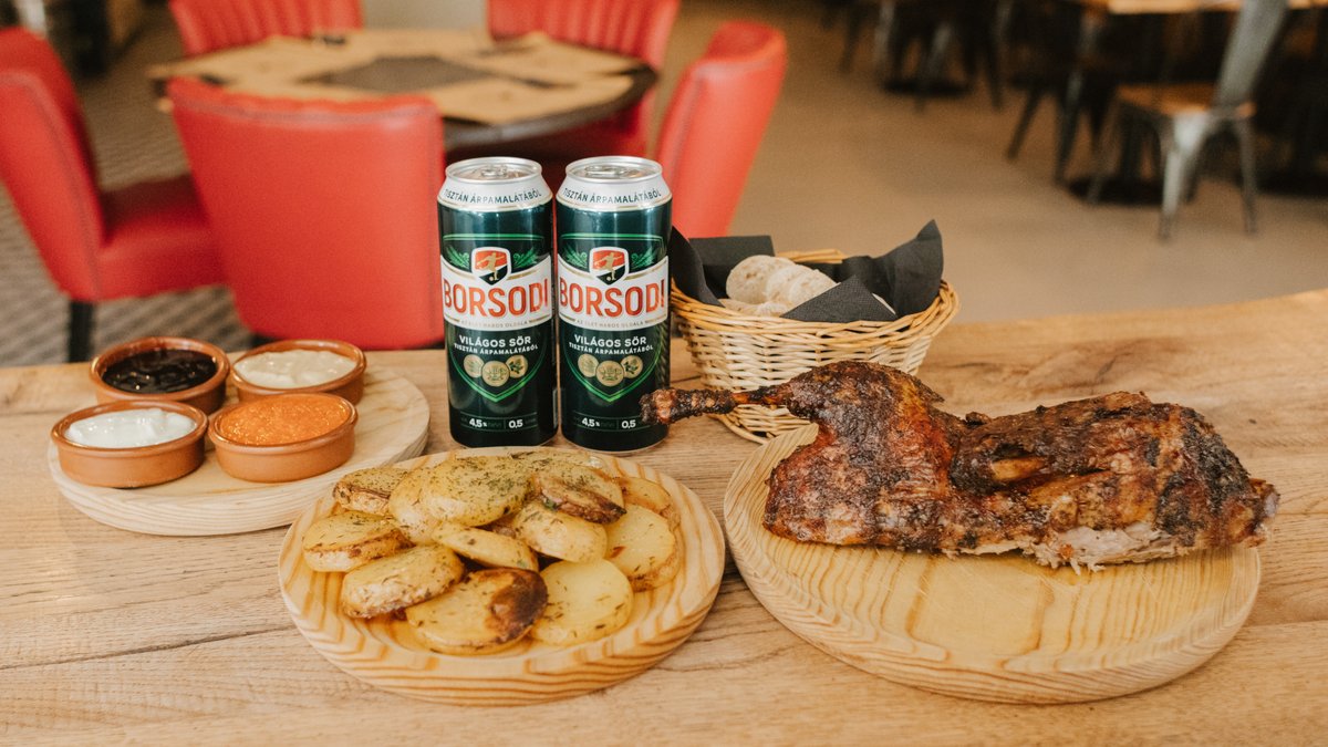 Egész csirke + krumpli + szósz + kenyér + 2x 0,5l sör