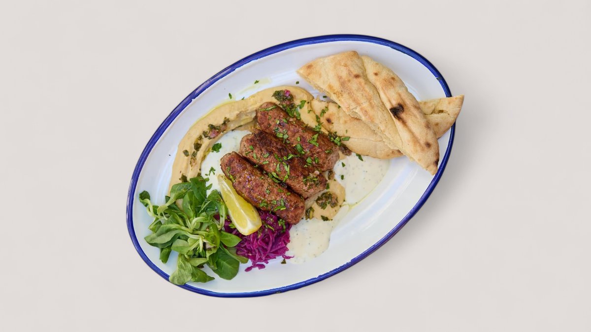 bárány kebab, humusz, mentás joghurt, lilakáposzta, chimichurri, paradicsom, pita, citrom /Lamb kebab, hummus, mint yogurt, red cabbage, chimichurri, tomato, pita, lemon