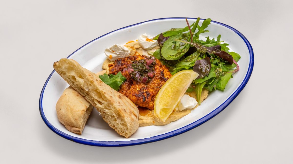 Közel-keleti fűszerezésű csirkemell, humusz, labneh, chimichurri, saláta, pita, citrom /Middle Eastern spiced chicken breast, hummus, labneh, chimichurri, salad, pita, lemon