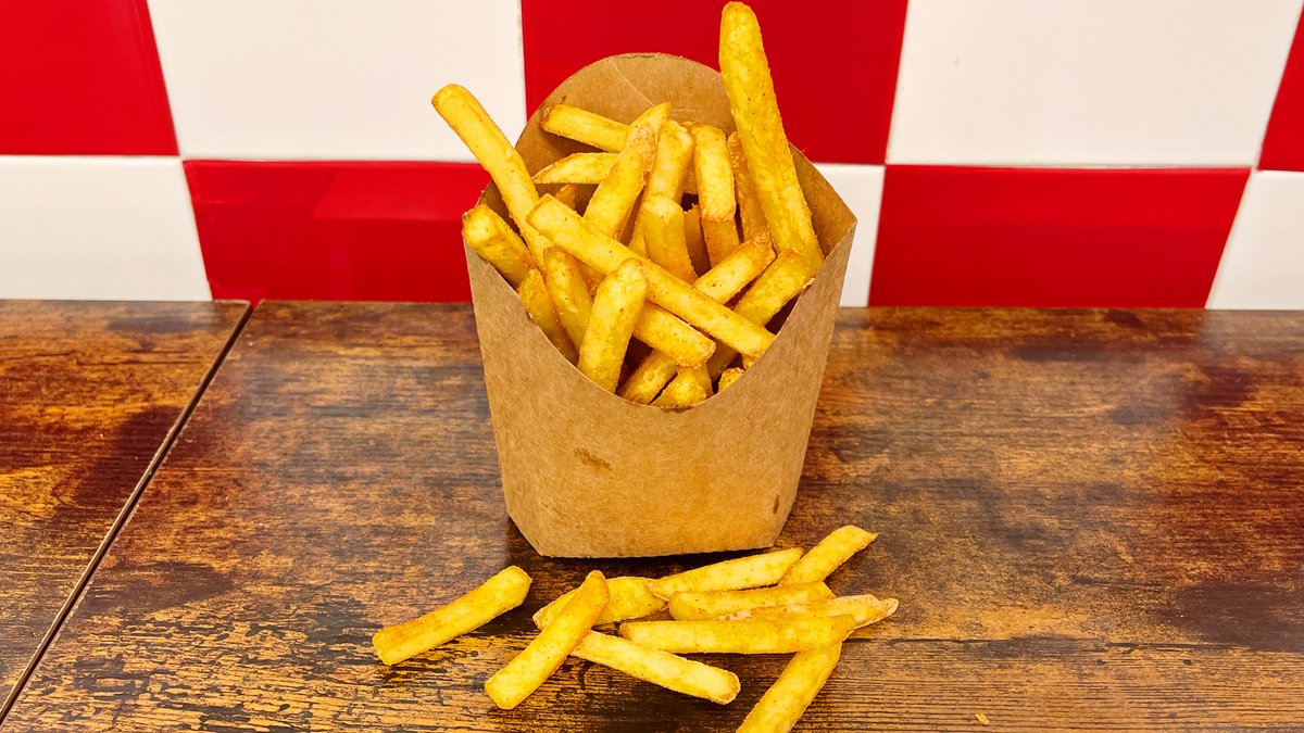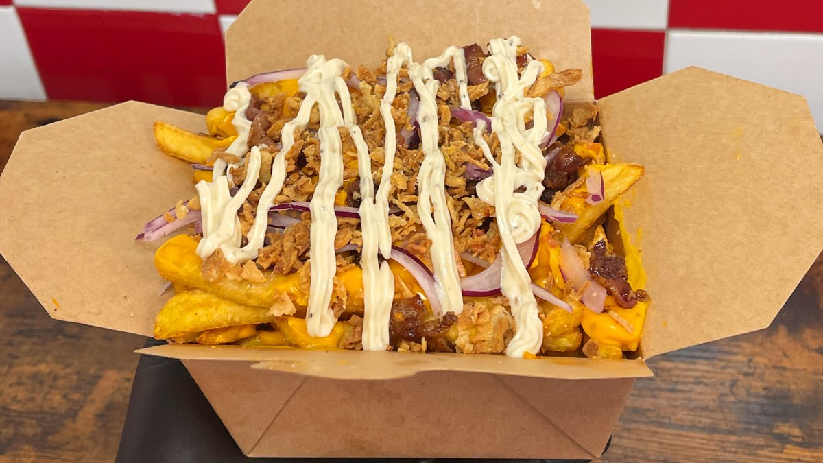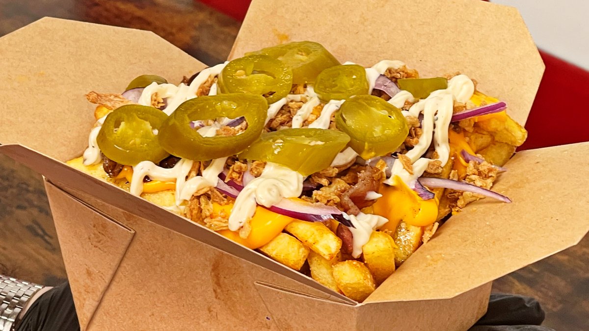 500g sült hasábburgonya (fűszeres), jalapeno, sajtszósz, szarvasgombás majonéz, pirított hagyma, bacon