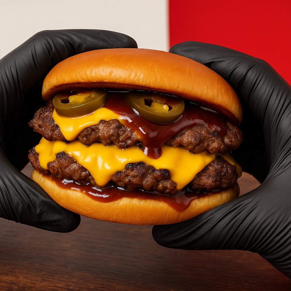 160g marhahús 100%, amerikai és görög cheddar sajtszósz, mexikói jalapeno, 86g francia brioche, pirított hagyma