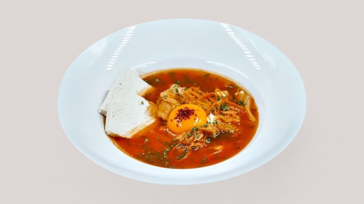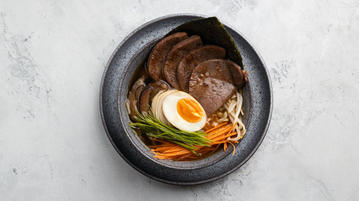 Marhahús, marhaalaplé, tészta, répa, shiitake gomba, babcsíra, újhagyma, tojás.