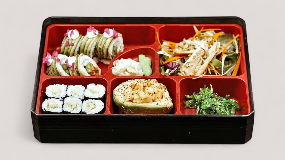 3 db japán retek maki, 3 db füstölt tofu maki, 3 db shiitake maki, 3 db uborka maki, 2 db avokádó nigiri, 1 db zöldséges bao, wakame