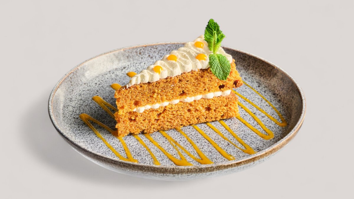**Kókuszos mangókrémleves** Selymes mangó és kókusztej, friss mentával, pirított mandulával tálalva.