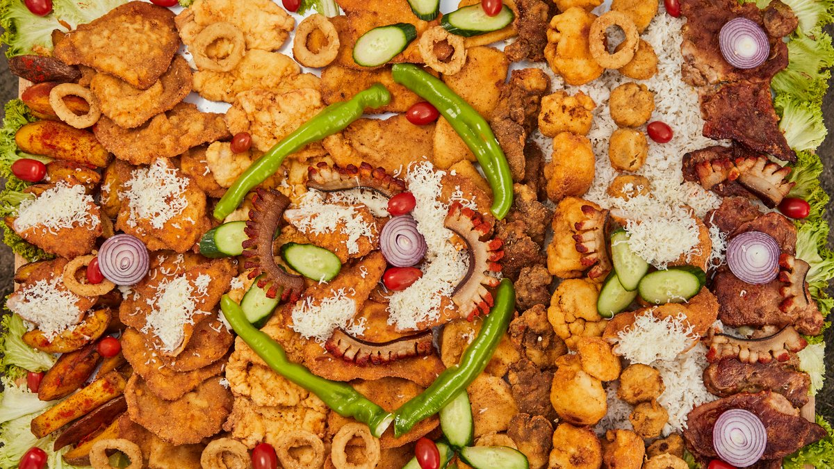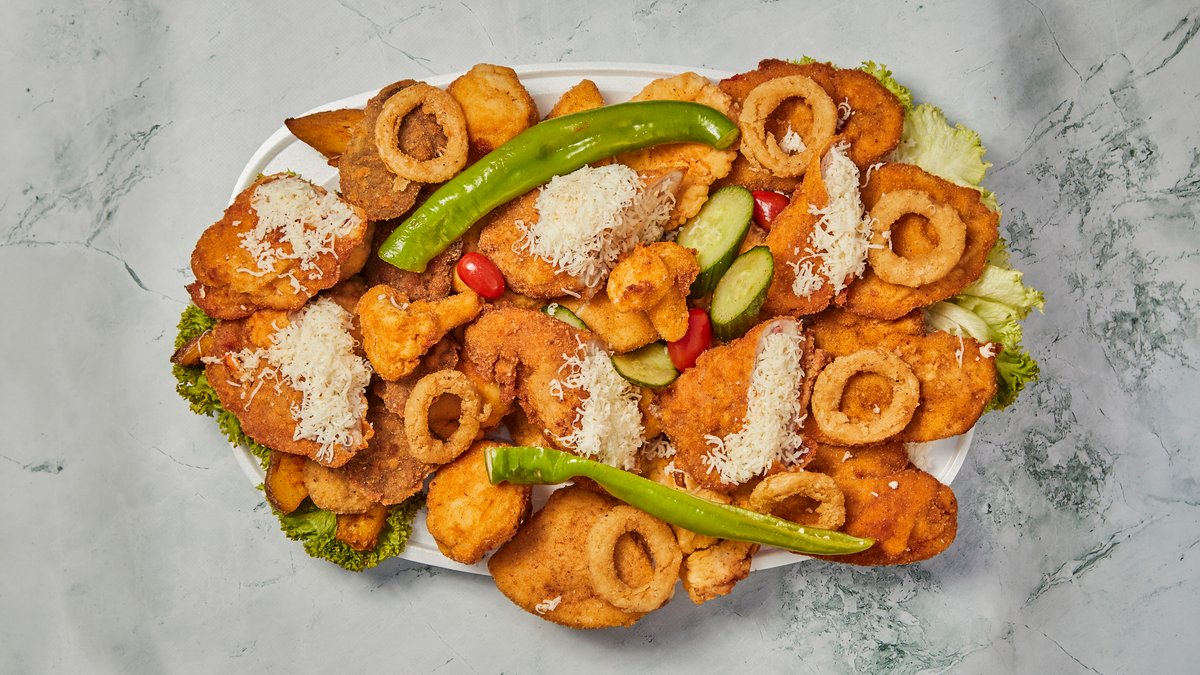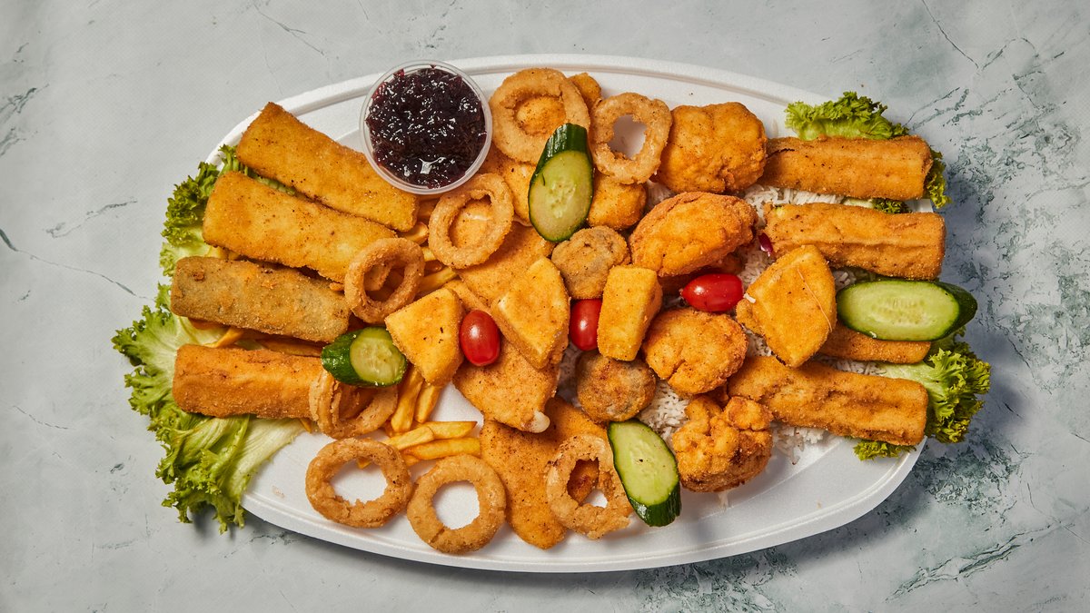 4 db Rántott sajt, 4 db rántott gomba (friss fejekből), 4 db rántott karfiol (rózsára szedve, ropogós bundában), 4db rántott cukkini 4db rántott tök, 4 db rántott camembert, 8 db hagymakarika Köret: 0.5 kg párolt rizs és 0.5 kg hasáb Ajándék a tálhoz: 2 kis adag tartármártás és 1 kis adag áfonyalekvár (a camembert-hez)