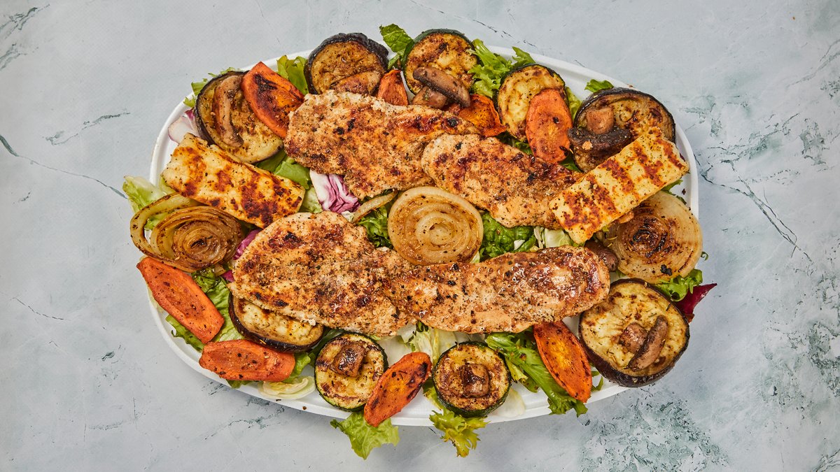 2 szelet grillezett csirkemel,2szelet grillezett sajt, és bő grillezett zöldségek