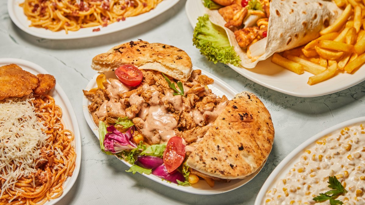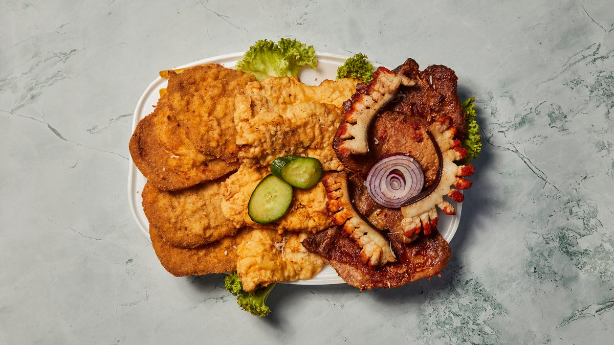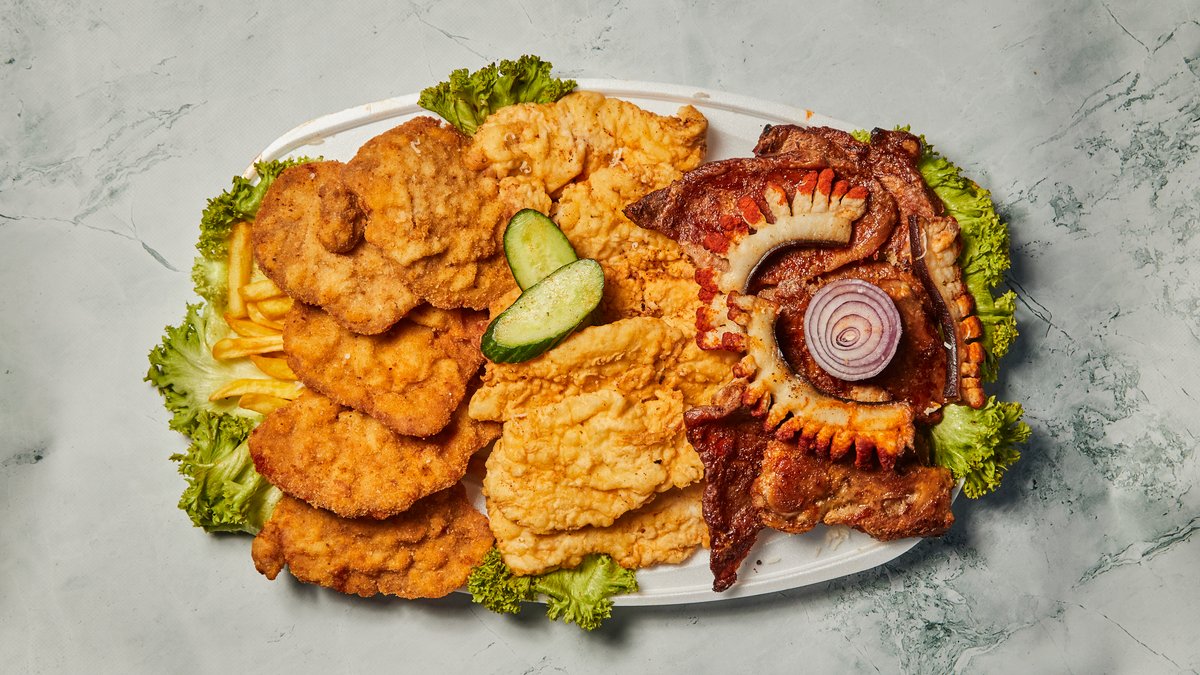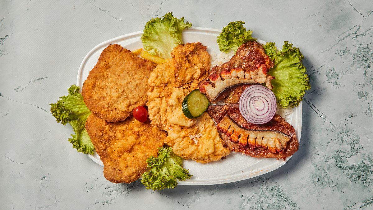 2 db burgonyás bundás csirkemell, 2 db rántott karaj, 2 db kakastaréjos cigánypecsenye. Köret: Vegyes köret (rizs és hasábburgonya)