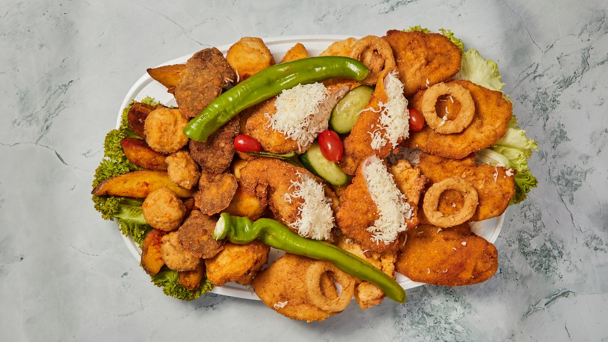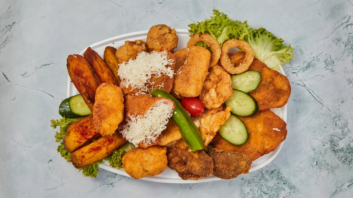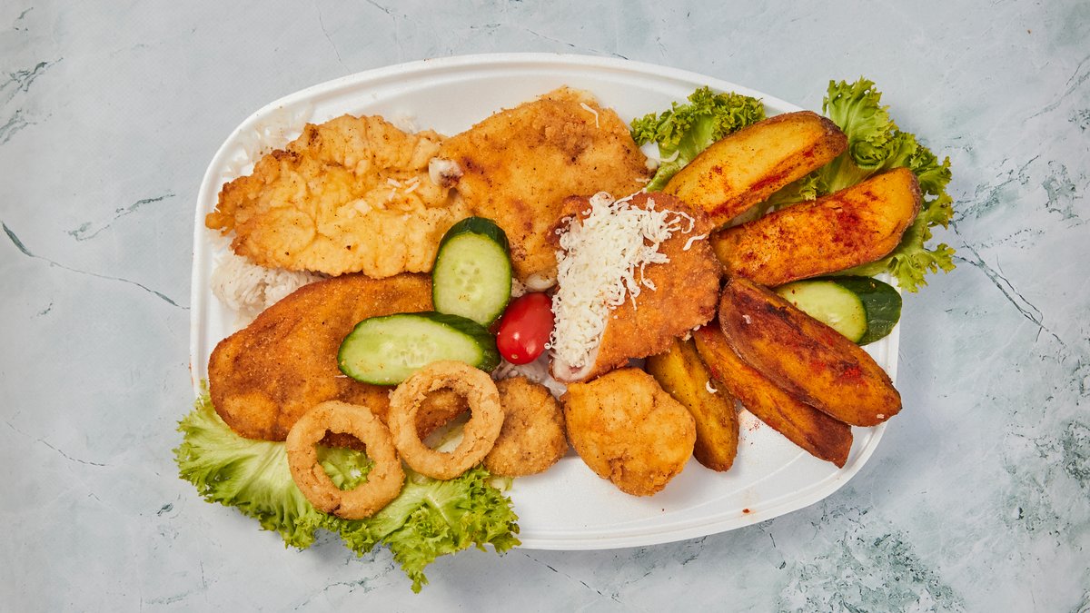 1db rántott csirkemell, 1db bundázott csirkemell, 1db rántott sajt, 1db rántott csirke máj, 1db cordon bleu, 4db hagymakarika, 0,25 kg. rántott karfiol, 0,25kg rántott gomba, 0,25 kg rizs, 0,25kg fűszeres steak krumpli