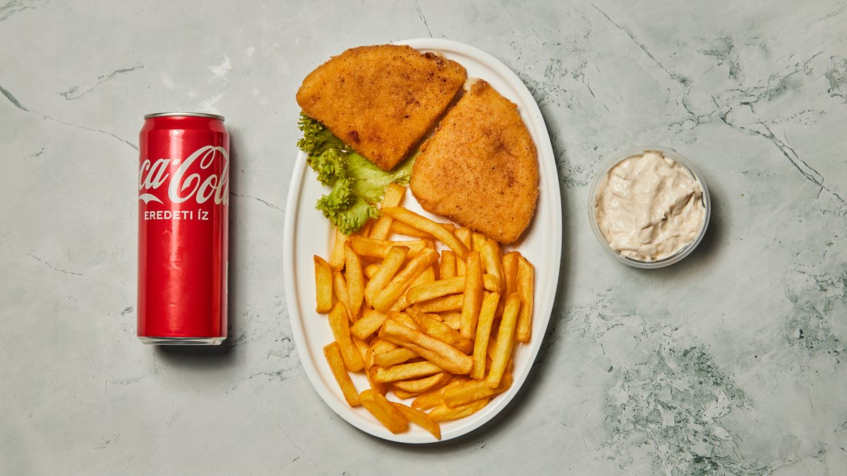 2db rántott csirkemell, választható köret rizs vagy hasáb, 1 adag tartármártás 0.08 l.,