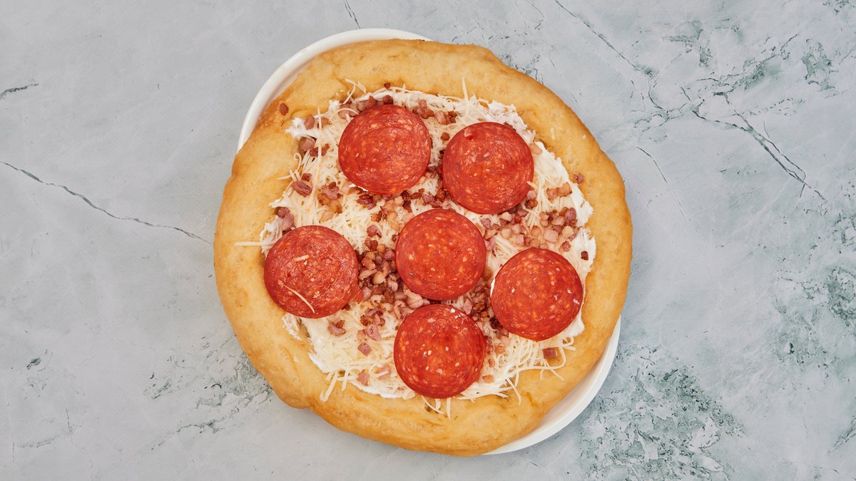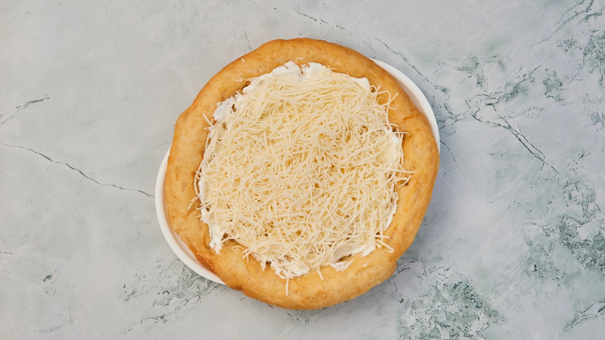 Aranybarnára sült, óriás méretű, kívül ropogós, belül puha hagyományos lángos.