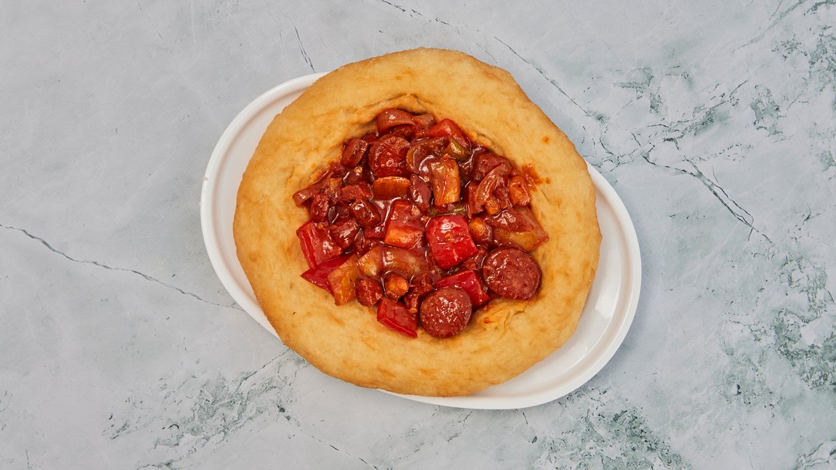 Igazi magyaros különlegesség! Házi, sűrű, kolbászos lecsóval gazdagon megpakolt óriás lángos.