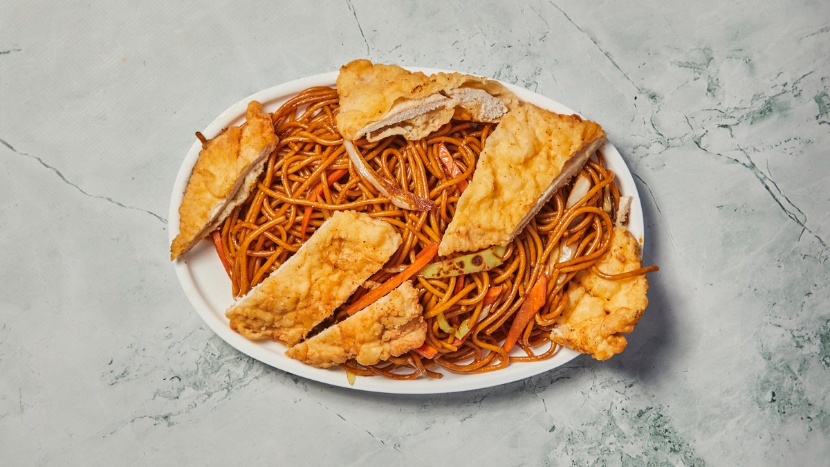 Házias, pirított tojásos tészta friss zöldségekkel (sárgarépa, káposzta, hagyma) összeforgatva, a tetején bőséges adag, aranybarnára sült, kívül ropogós, belül szaftos "illatos-omlós" csirkemell csíkokkal