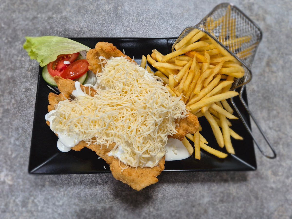 Rántott csirkemell fokhagymás tejfölös szósszal és sajtszórással