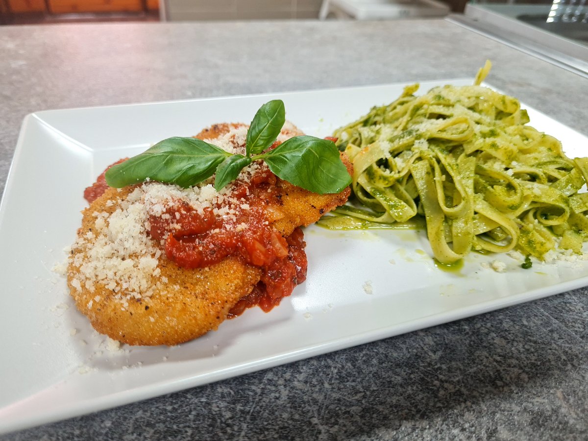 **Parmezános csirke pestos tésztával** Lágyan sült, ropogós parmezánkéreggel borított csirkemell, amelyet friss, házilag készült Pestos tésztával kínálunk. Az ételt al dente főtt tészta és illatos bazsalikom teszi teljessé, hogy minden falat igazi olasz ízvilágot idézzen. Egy tökéletes választás azoknak, akik szeretik az egyszerű, mégis ínycsiklandó mediterrán fogásokat. !ALLERGÉNEKET, TÖBBEK KÖZÖTT MOGYORÓT TARTALMAZ!