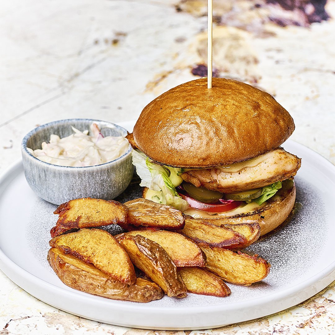 Csirkeburger, Fekete Fokhagymás Majonéz, Lilahagyma , Paradicsom, Coleslaw,Sült burgonya (3,10)