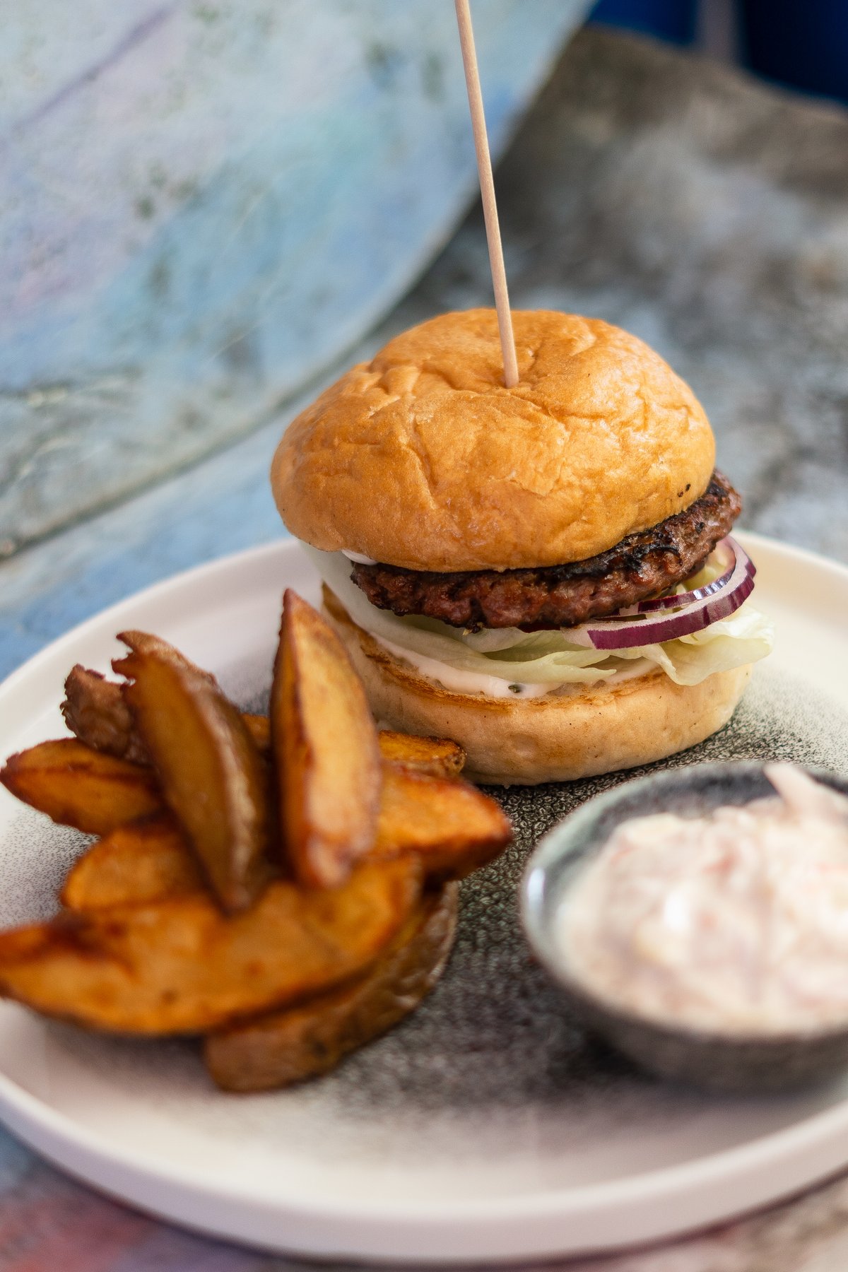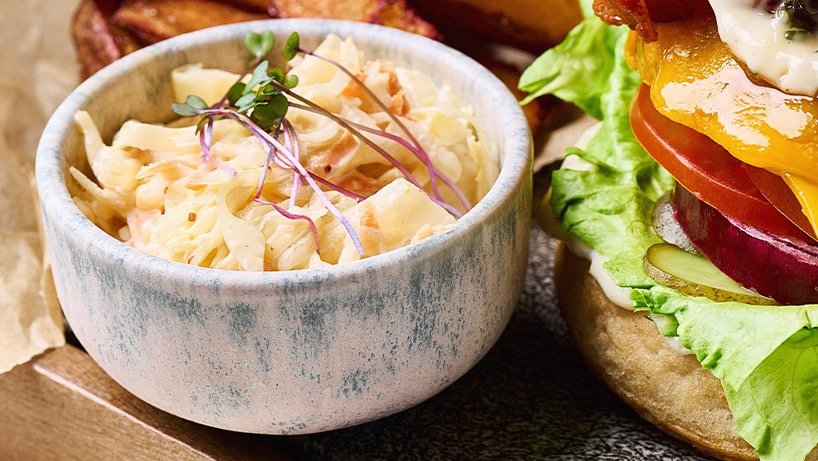 A burgereket coleslaw salátával és hasábburgonyával tálaljuk