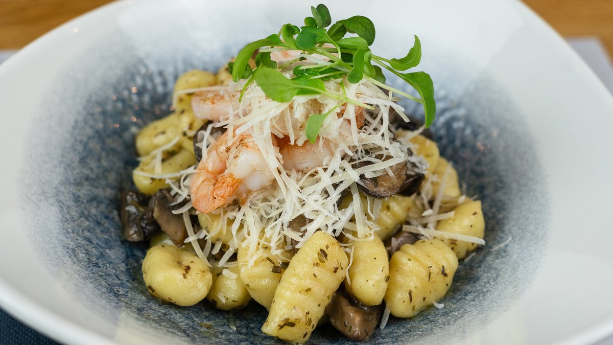 Fehérboros Vajas Gnocchi Gombával és Parmezánnal, Garnélával (2,7)