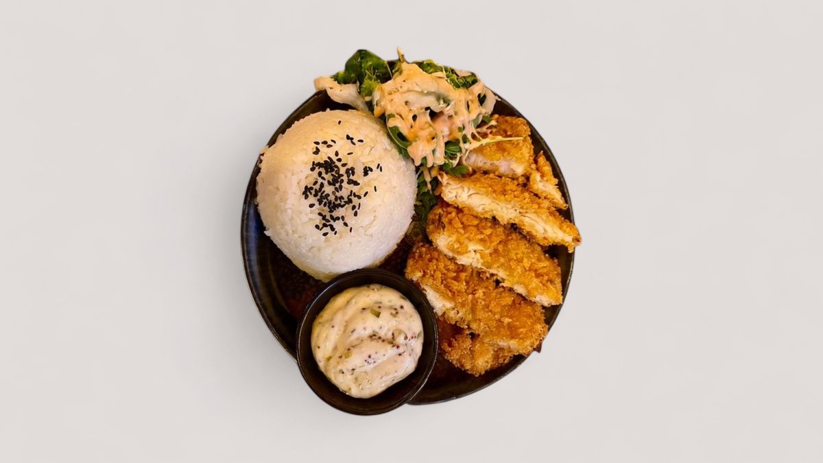 Chicken, rice, salad, sweet & spicy sauce, cheese slice
