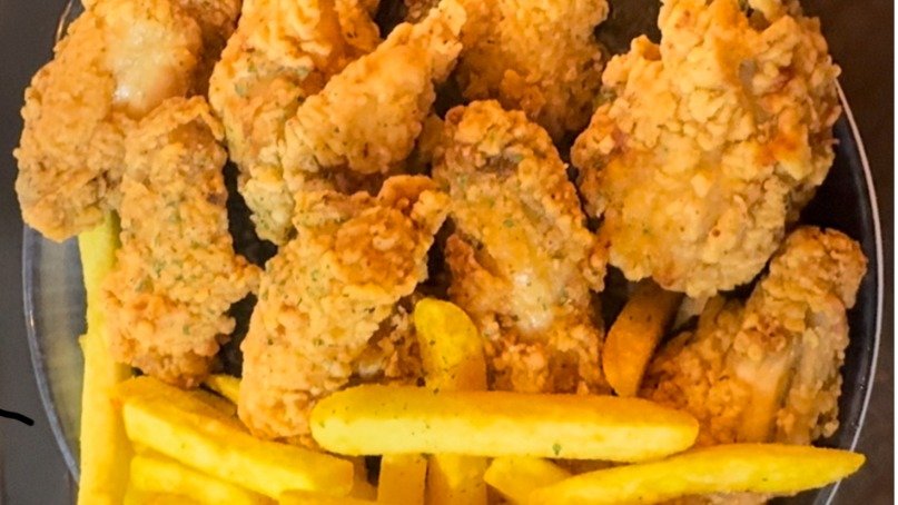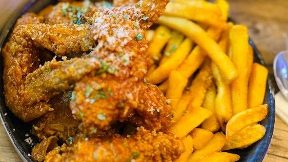 Fried chicken coated with sweet & spicy sauce 8pcs, with Cheese sprinkle, french fries