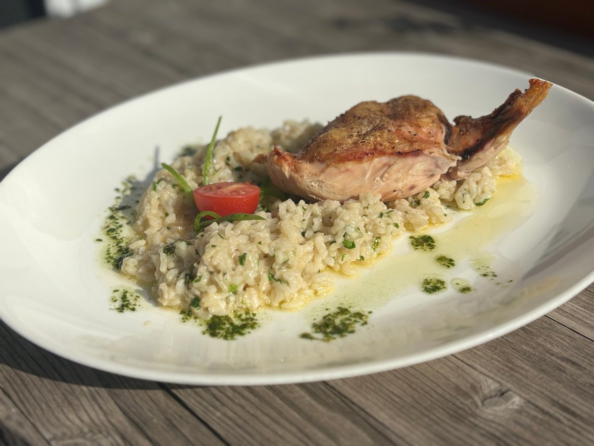 Fűszervajas bébi csirke, édesburgonya hasábbal, zöld majonézzel