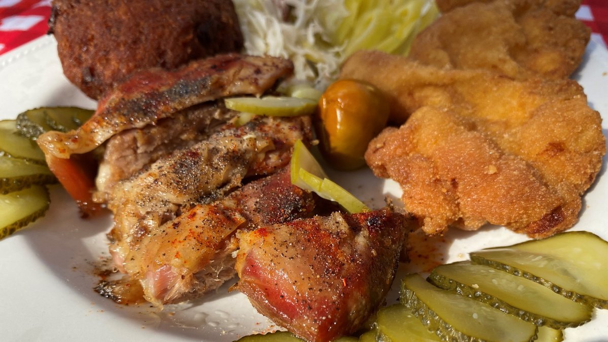 2 szelet rántott csirkemell filé, 6 db fasírt, 2 db rántott sajt,4 db rántott máj, 4 db pecsenye, 1 db sült kolbász, 400 g hurka, 600 g steakburgonya, 100 g cseresznyepaprika, 4 db házi mustár