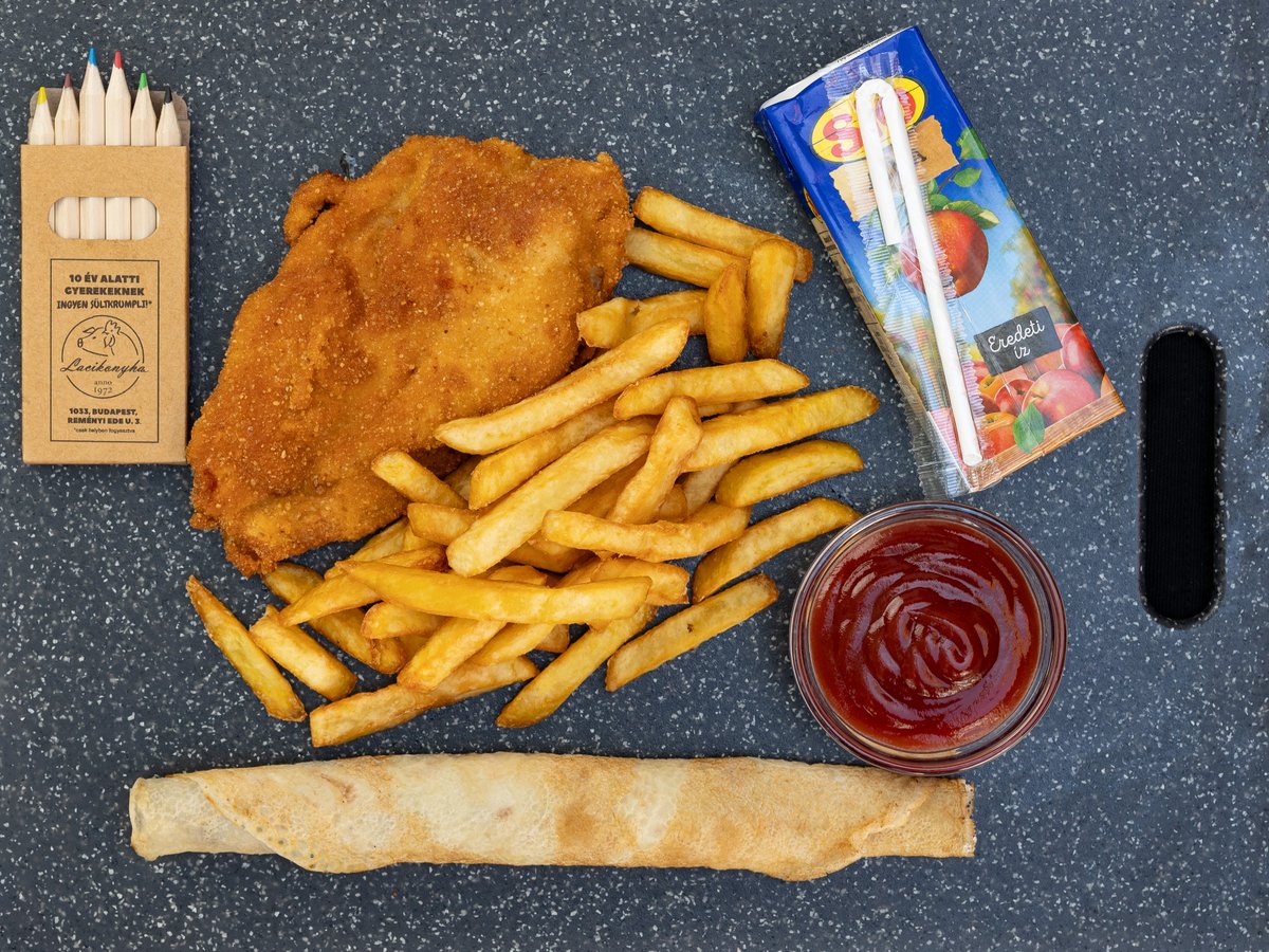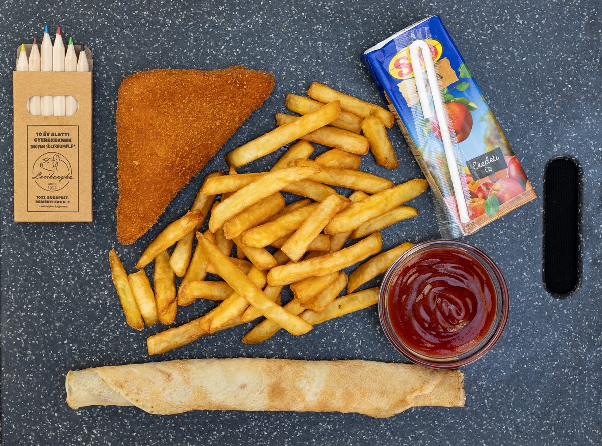 rántott csirkemell, hasábburgonya, ketchup, nutellás palacsinta, 2dl üdítőital, ajándék játék