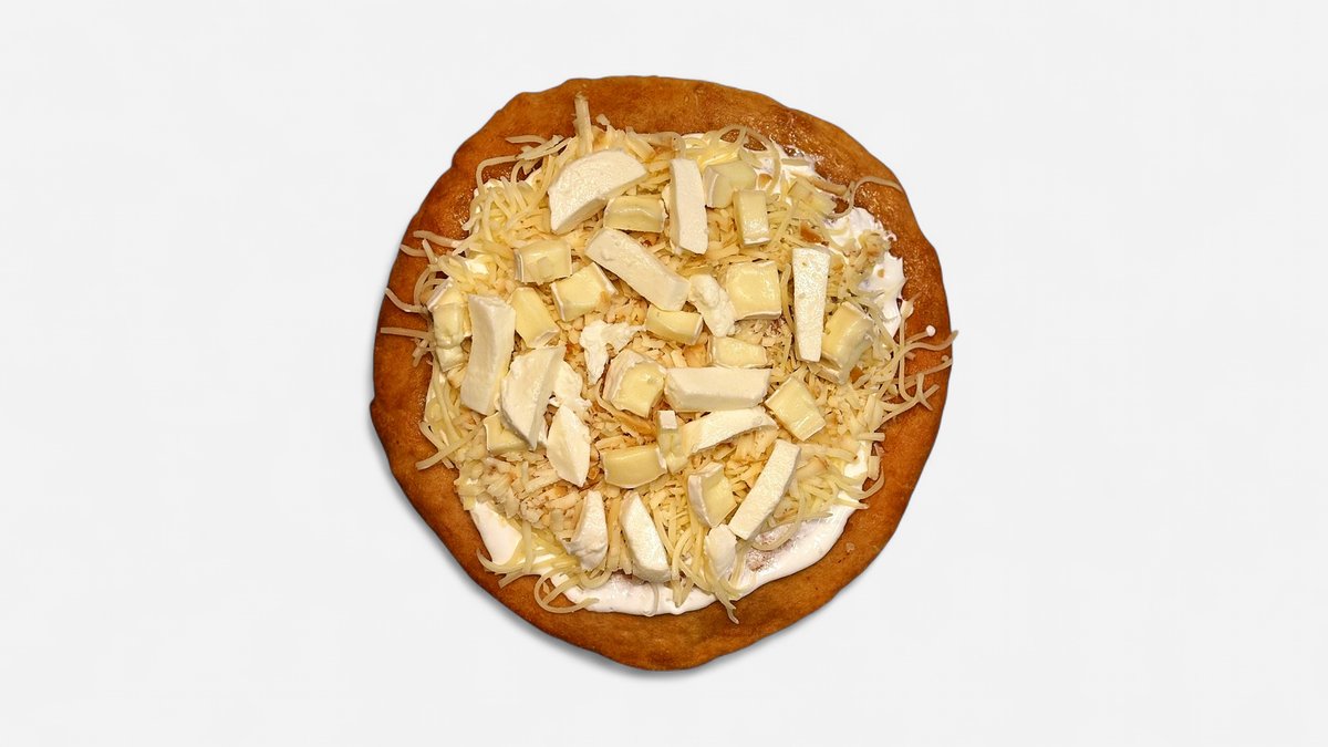 Hagyományos magyar lángos tejföllel, reszelt trappista sajttal, camembert sajttal, mozzella sajttal és füstölt trappista sajttal.
