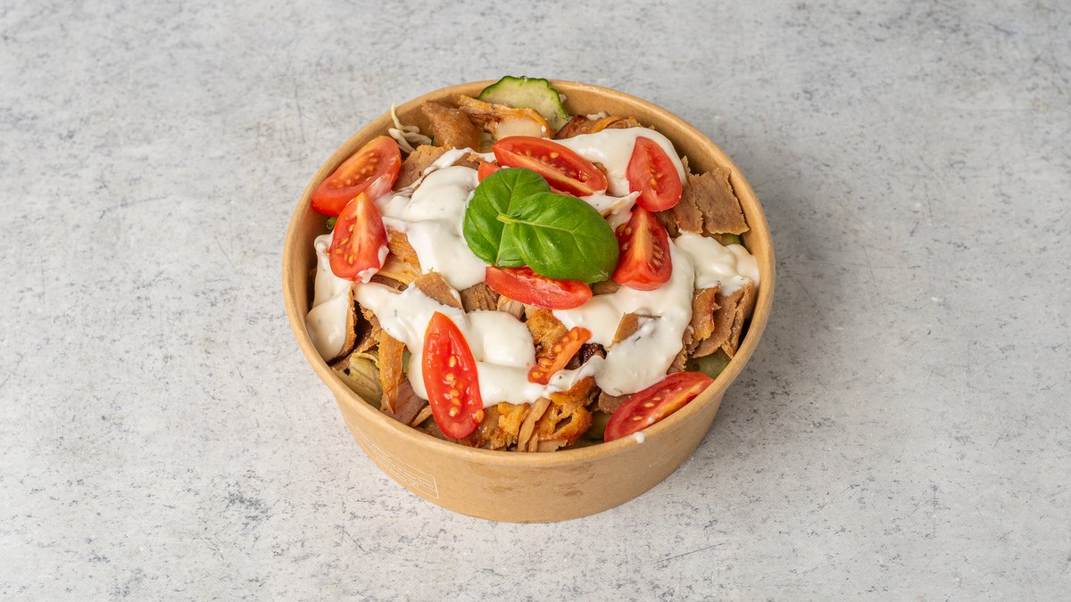 káposzta, jégsaláta, hagyma, uborka, paradicsom, joghurtos öntet, csirke- vagy borjú hús, burrata sajt