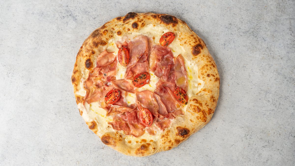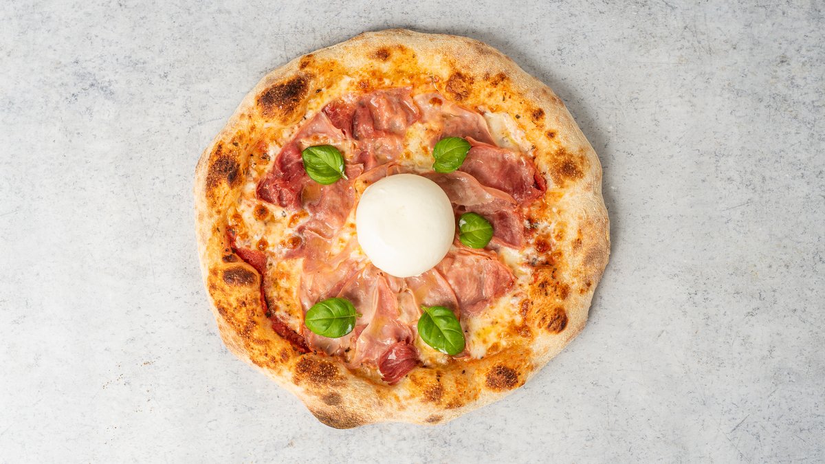 San Marzano D.O.P., Fior di latte, prosciutto cotto, burrata sajt, bazsalikom, olívaolaj