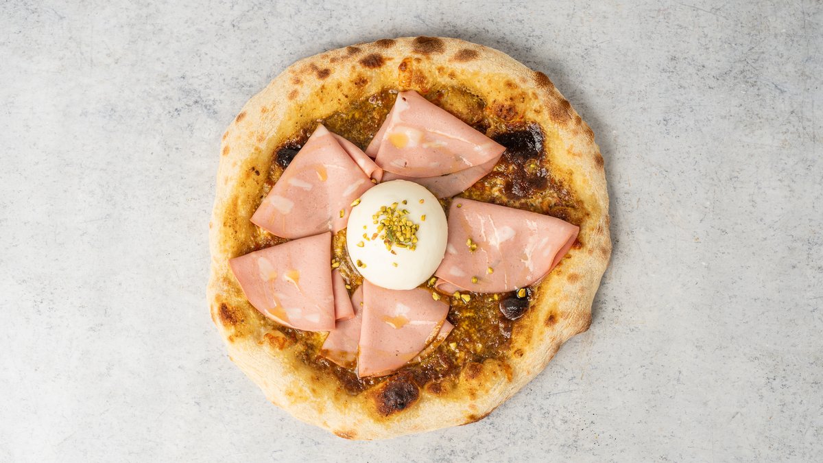 pisztáciás pesto alap, Fior di latte, burrata sajt, főtt sonka, darált pisztácia, olívaolaj, bazsalikom