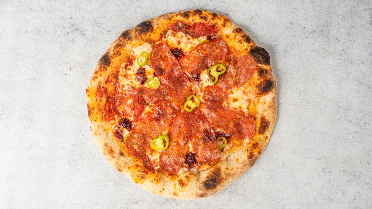 San Marzano D.O.P., Fior di latte, csípős szalámi, kolbászkrém, lilahagyma, hegyes erős paprika