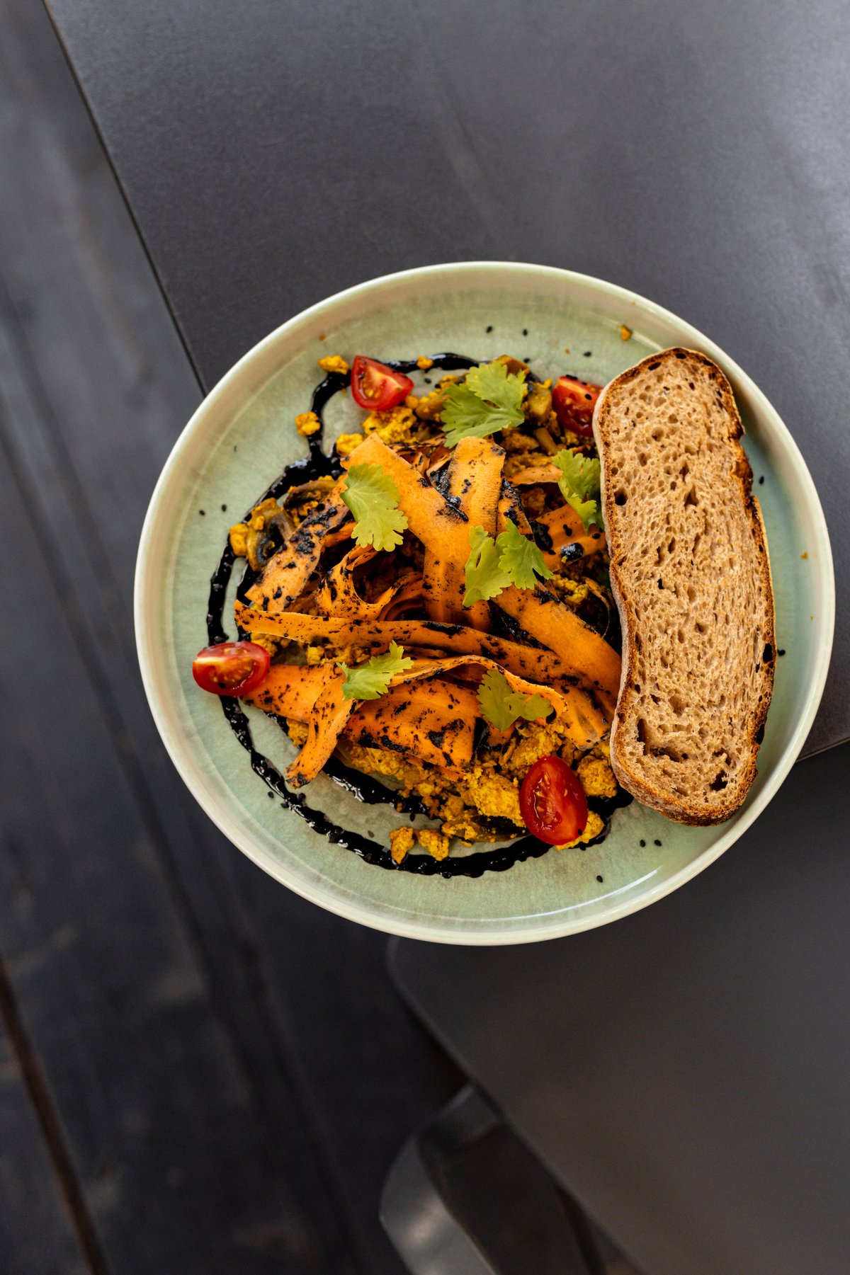 Füstölt tofurántotta, gomba, dinsztelt hagyma, hoishin szósszal, siracha majonézzel, korianderrel egy kovászos kenyéren