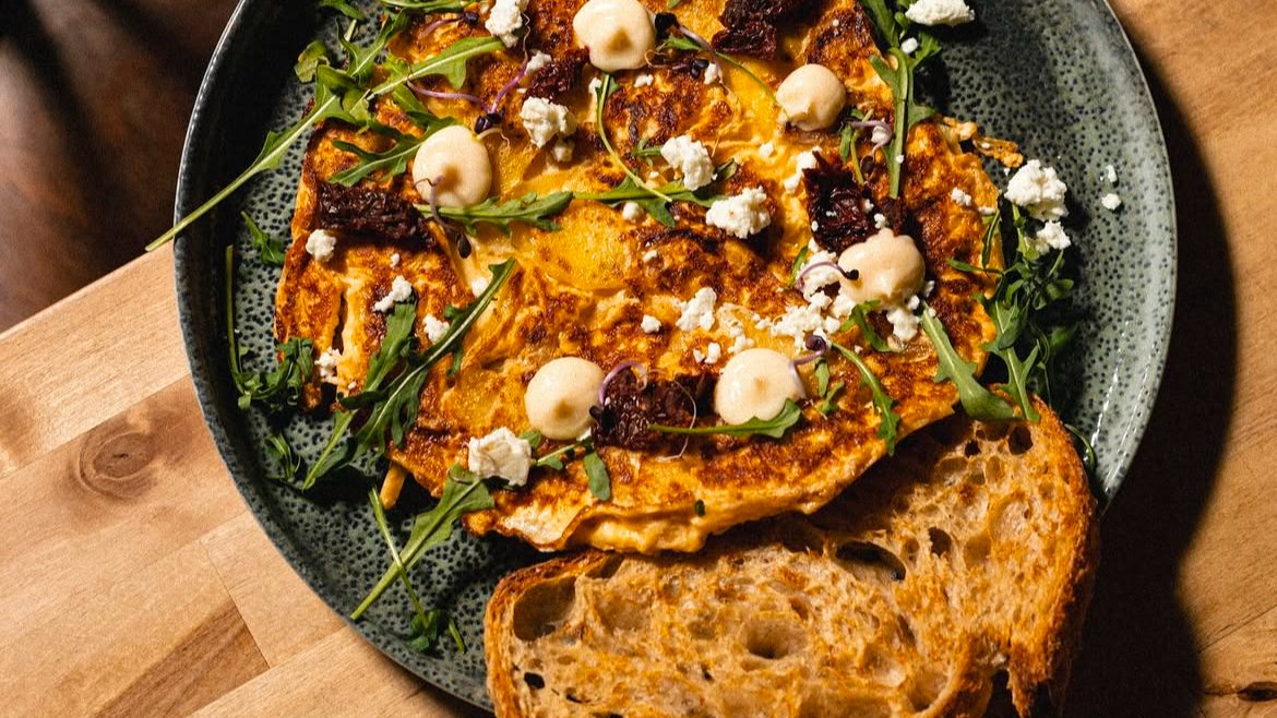 3 tojásos omlett, karamelizált hagyma, burgonya, házi aili, kovászos kenyér. feta sajt és szárított paradicsom