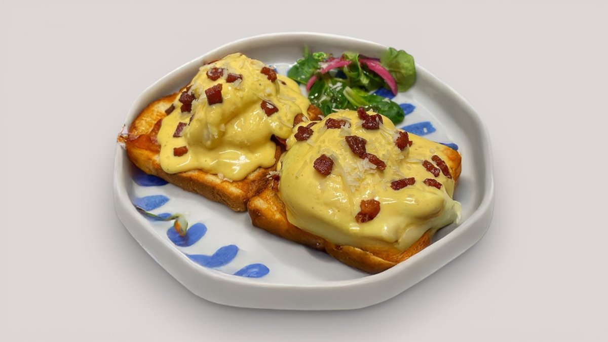 2 bugyantott tojás, sajtszórás és sült szalonna kalácson, carbonara szószos Hollandi mártással