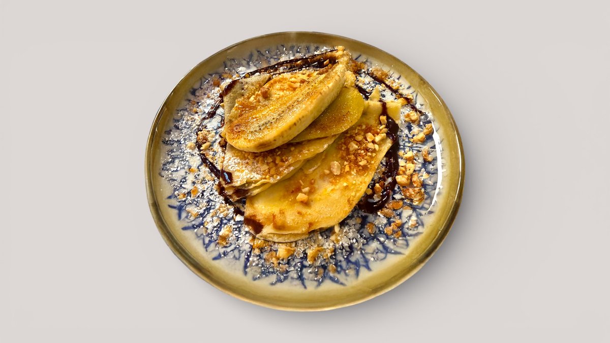 2 db palacsinta Nutellával tölve, grillezett banánnal, karamellizált törökmogyoróval