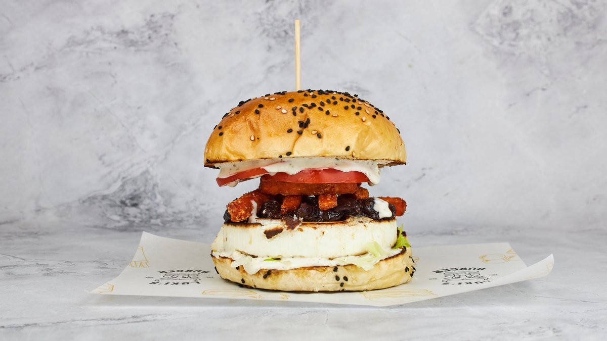 brioche buci, LB szósz, grillezett hagyma, dupla smashed pogácsa, dupla ír cheddar sajt, áfonyalekvár, mogyoróvaj