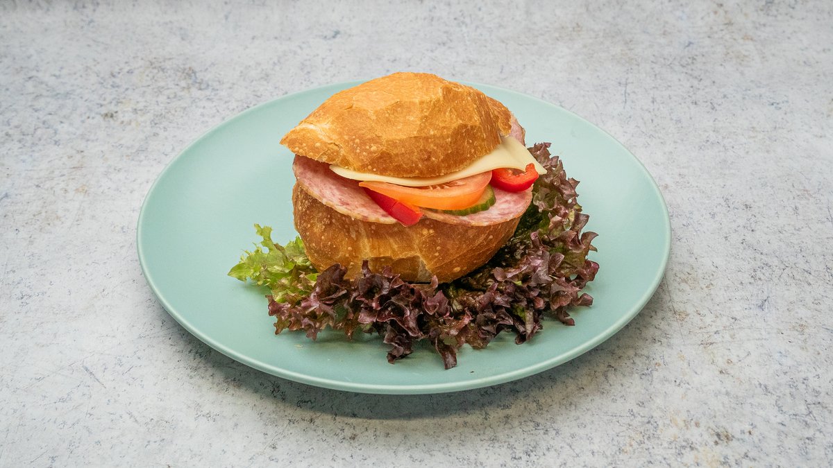 Helyben sütött nagykifli, vaj, szalámi, sajt