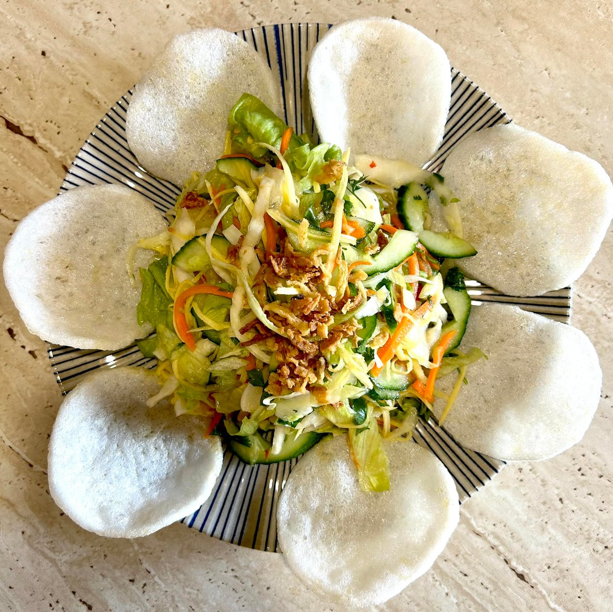 sertéshús, zöldségek, fafülgomba, tojás, rizstészta lapba tekerve, friss salátával /2db/