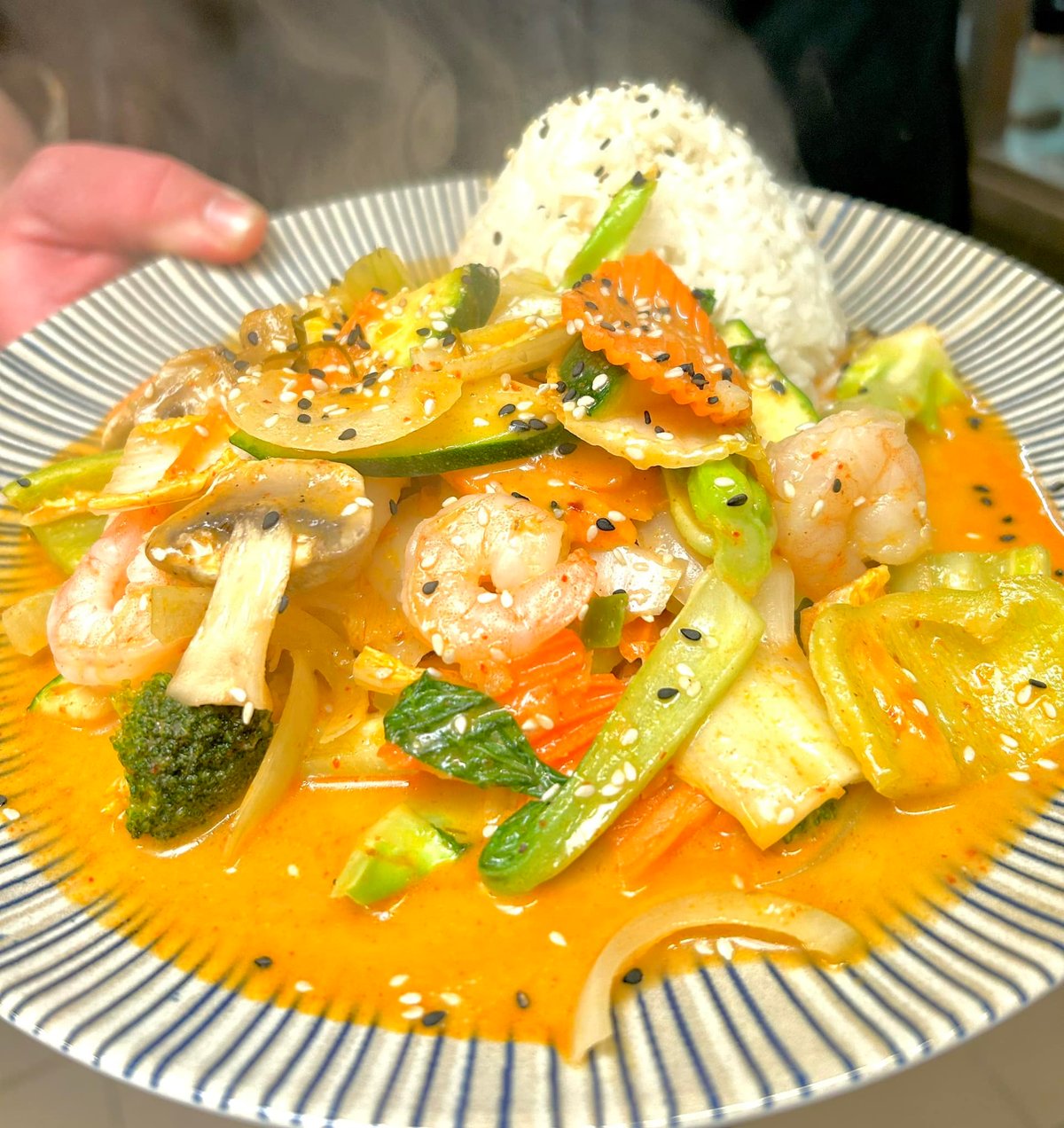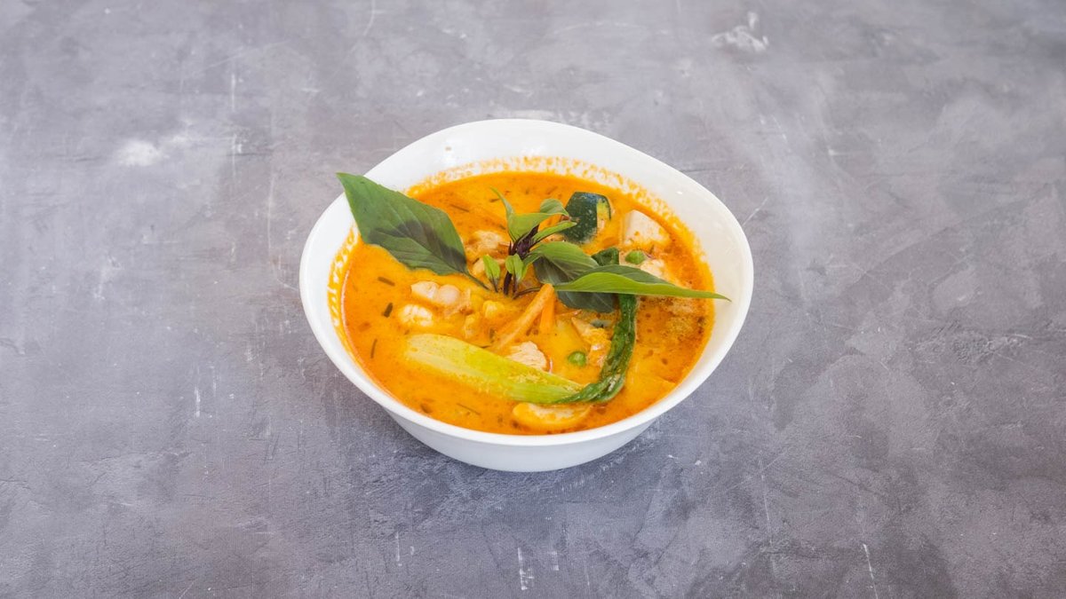 tejszín, kókusztej, curry, csirkemell csíkok, marhahús, kacsa, garnélarák, vegyes zöldség, jázminrizzsel