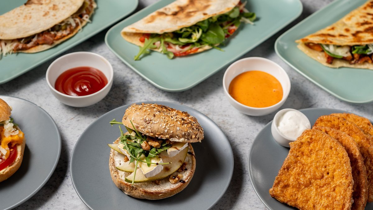 Sajtkrém, majonézes-lilahagymás-borsos tonhalkrém, zöldsaláta, paradicsom